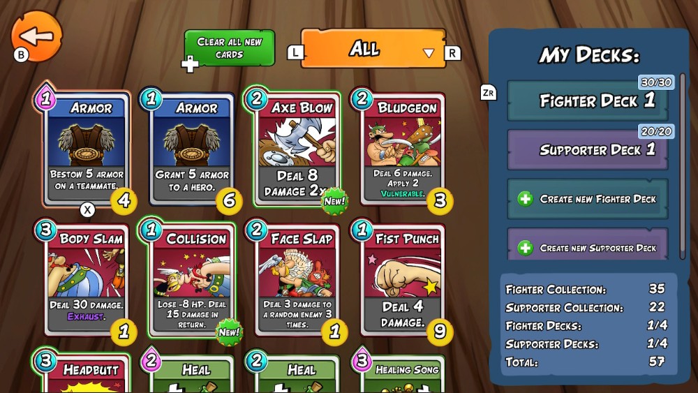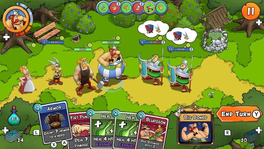 I got asked if this game is for me. Since I like deck-builders and was looking for more games to play on my switch I gave Asterix & Obelix a try. In deck builders you mostly start with a small deck of cards. These are basic and low value. In the case of Asterix and Obelix, you start with lots of starter decks, since you are playing with a team. Each turn for your side, you draw cards and choose which ones to play. Throughout the game you get the change to upgrade cards, get new ones and delete cards from your deck. Combine tactfully to get the most out of your deck.